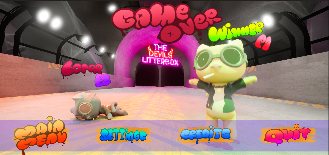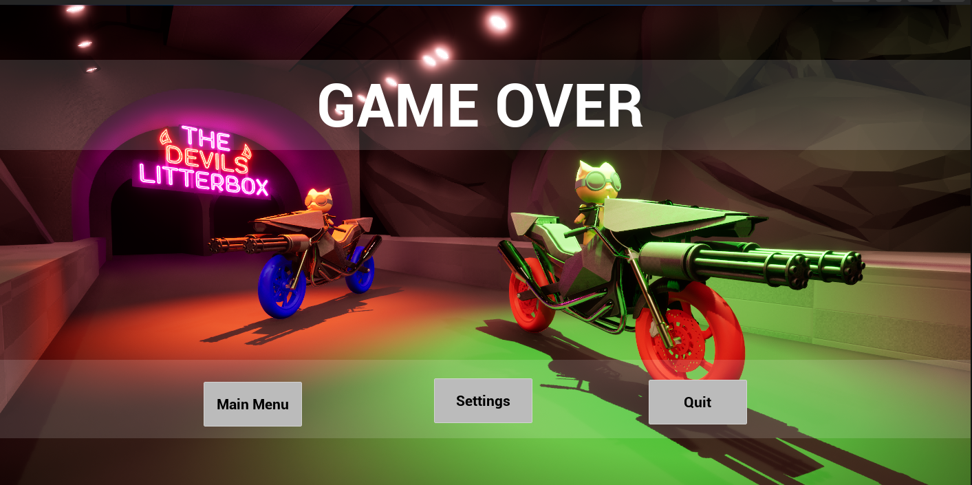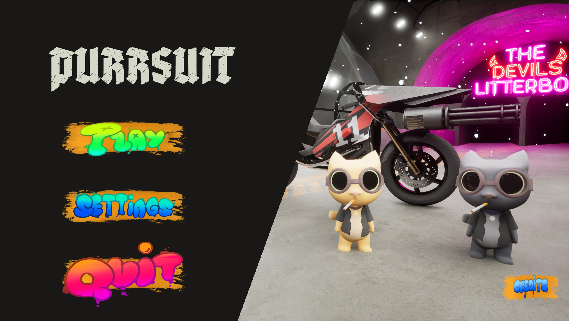Purrsuit is a no-holds-barred multiplayer arena game set in “The Litterbox,” a chaotic stadium where stray cats battle atop weaponized motorbikes. Players shoot out sections of the arena floor to send opponents falling into “Purr-gatory,” while dodging hazards and outmaneuvering rivals at high speed.
